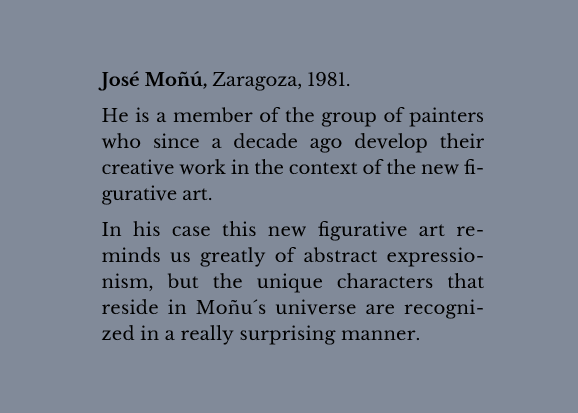 In his case this new fugurative art reminds us greatly of abstract expressionism, but the unique characters that reside in Moñu´s universe are recognized in a really surprising manner.